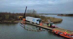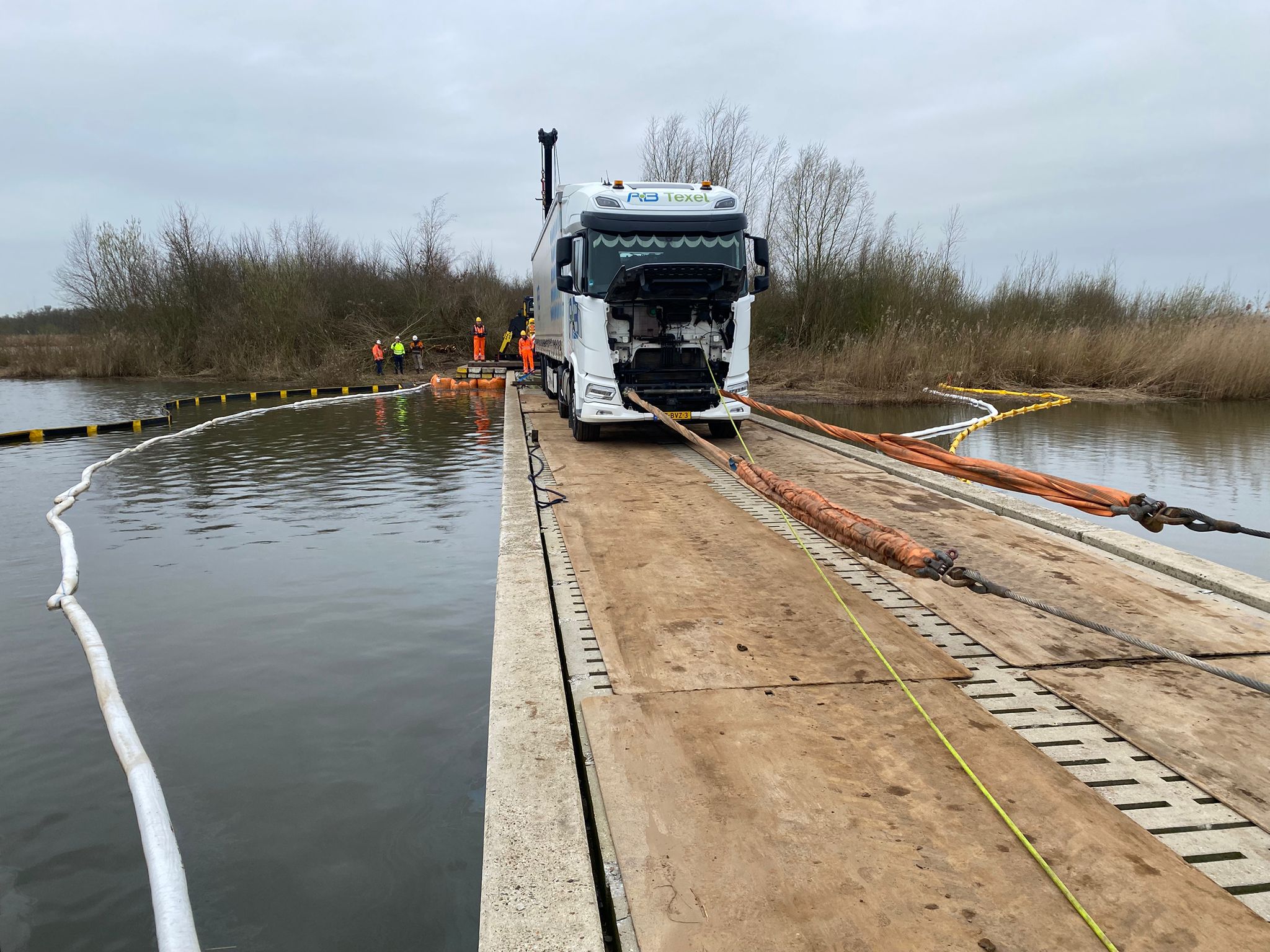 Daarna hebben we, in samenwerking met Rijkswaterstaat, Staatsbosbeheer en de verzekeringsmaatschappij, een veilige en verantwoorde berging uitgevoerd. Om dit mogelijk te maken zijn omliggende bruggen eerst verzwaard, zodat takelwagens het incident veilig konden bereiken. Vervolgens is de vrachtwagen met twee takelwagens gecontroleerd verwijderd en naar de overzijde verplaatst.