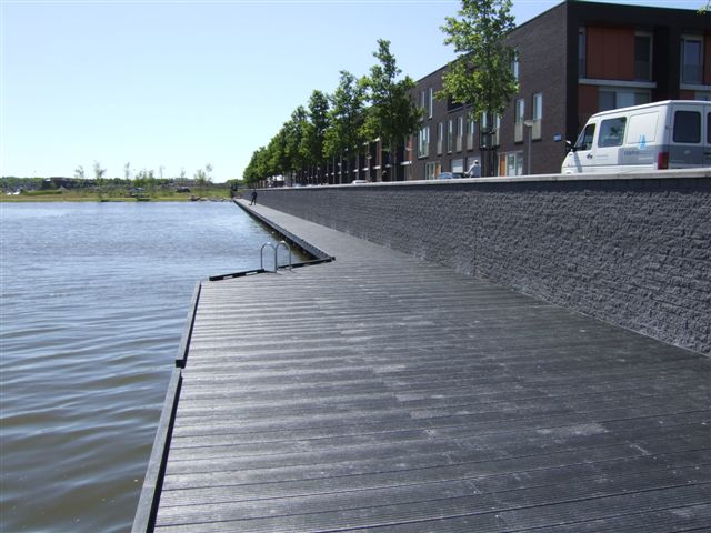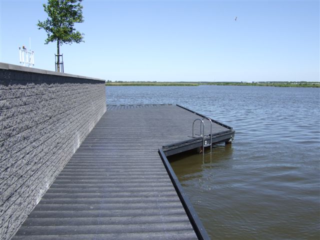 Voor de gemeente Almere hebben wij een aanlegsteiger gerealiseerd, waarbij de fundering van stalen buispalen is. De overige onderdelen van de steiger zijn van HDPE-kunststof.