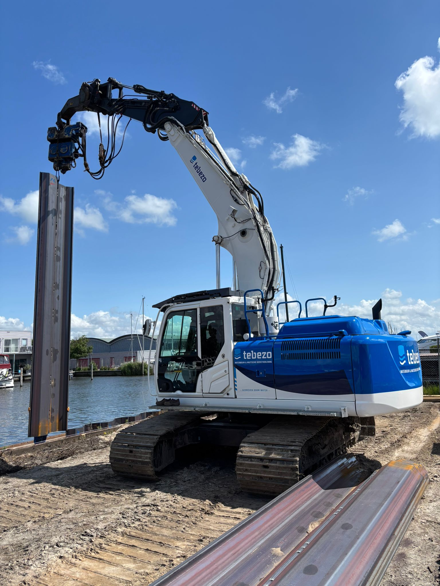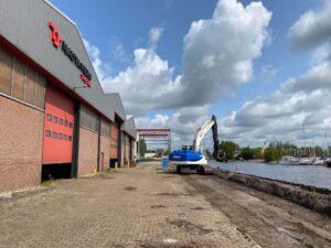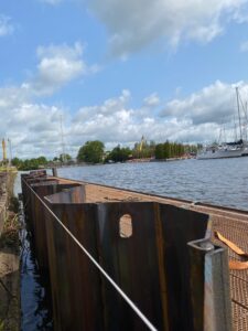 In opdracht van Nauta Heeg zijn wij deze week begonnen met het vervangen van de bestaande houten damwand. We plaatsen een nieuwe, 160 meter lange stalen damwand, die wordt verankerd met legankers – zodat de kade er weer jarenlange tegenaan kan!