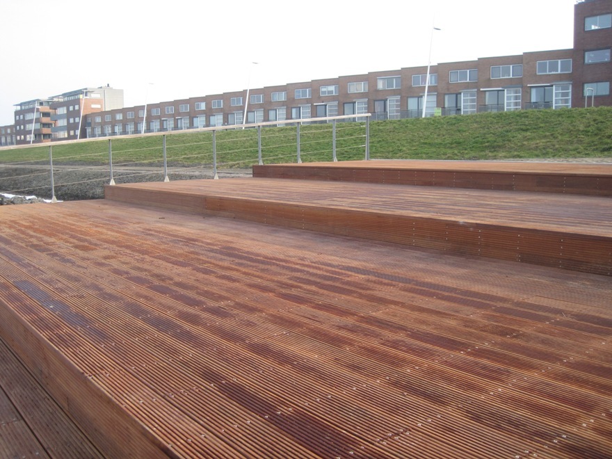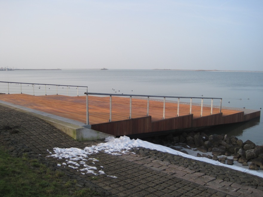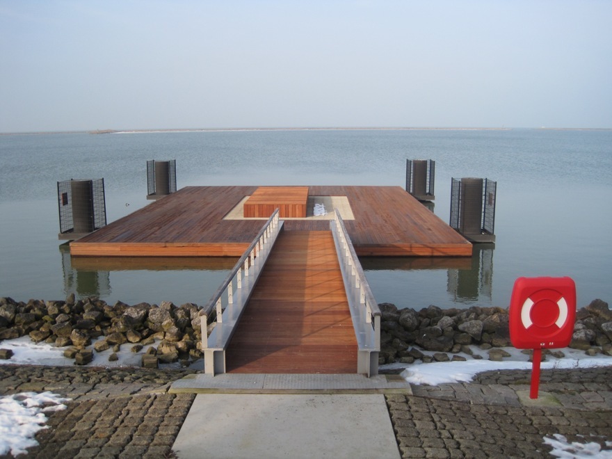 - Een stalen ponton, geheel bekleed met hout, met in het midden een doorkijk op het water. Deze loopbrug op het ponton ligt a-symetrisch en is letterlijk en figuurlijk “in balans”.